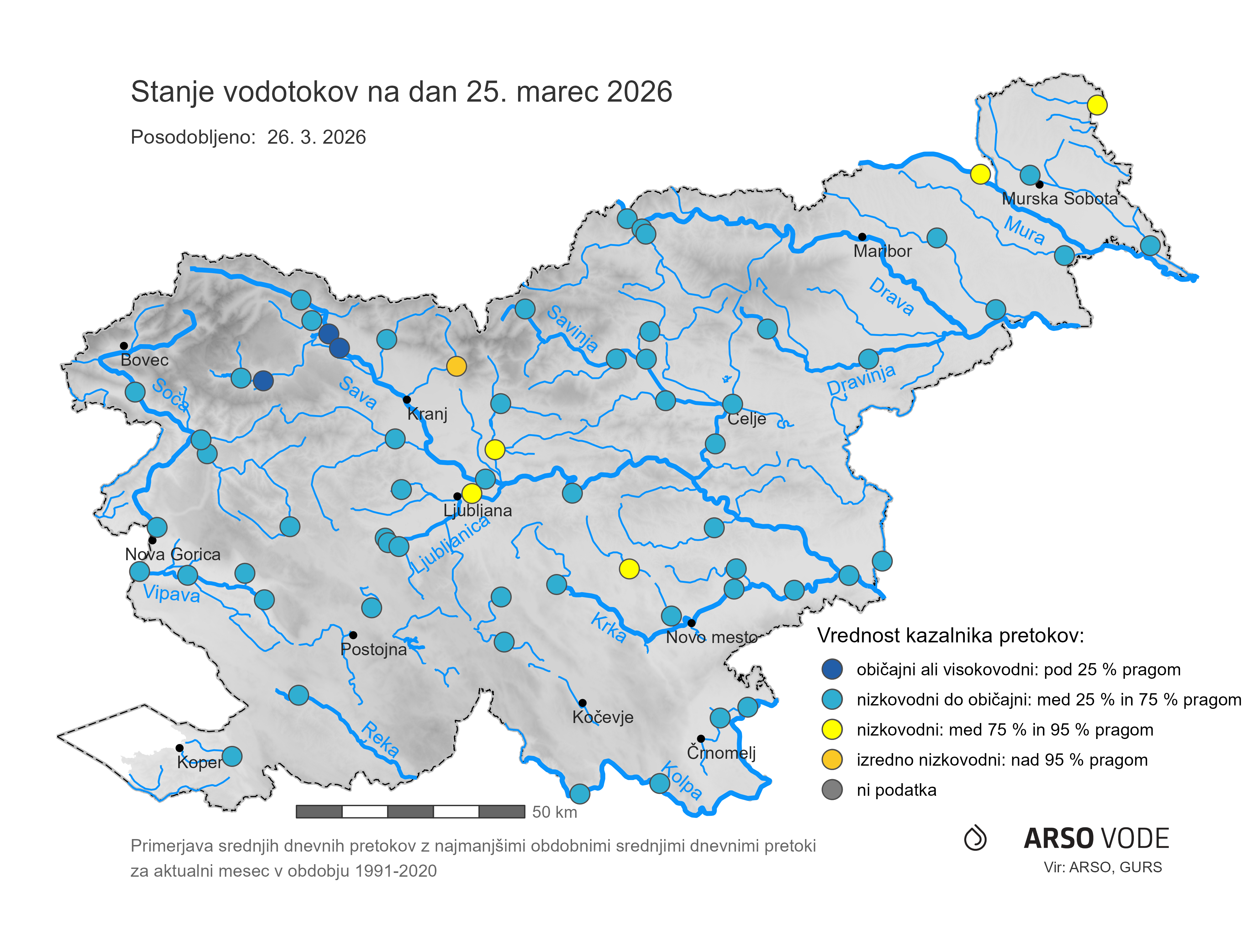 manjši od 25. percentila najmanjših dnevnih pretokov za tekoči mesec v obdobju 1991-2020 (25 odstotna