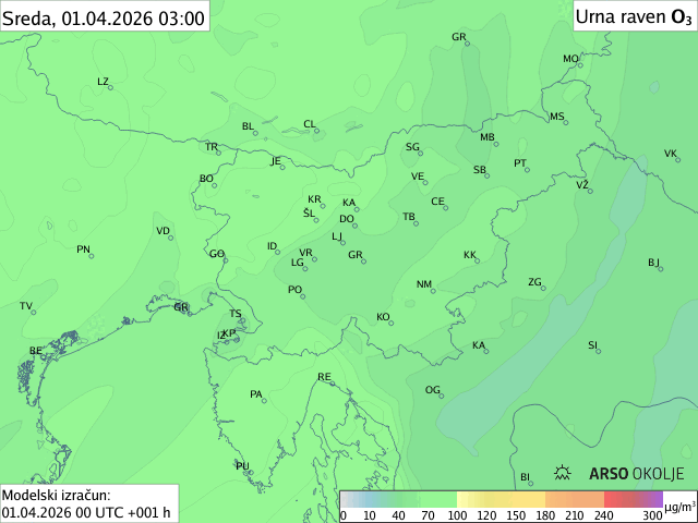 Modelska napoved prikazuje ravni ozona za danes in jutri. Poleg simulacije urnih ravni ozona za