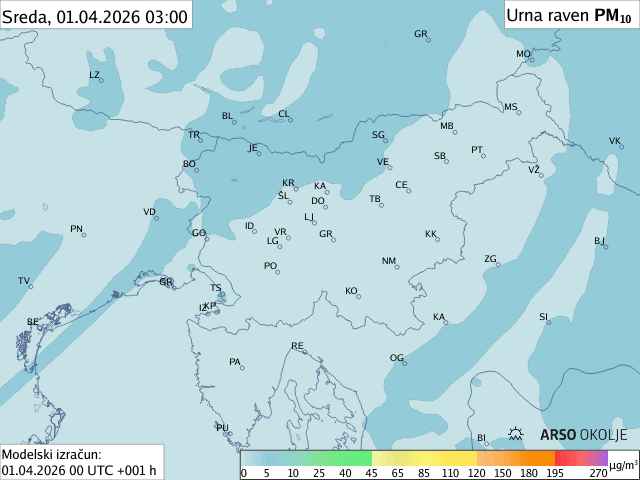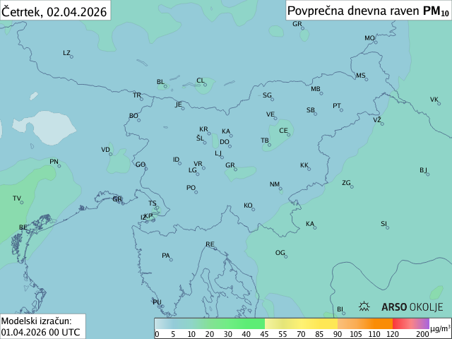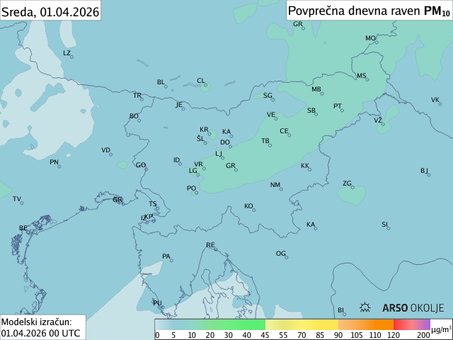 Modelska napoved prikazuje urne ravni delcev za danes in jutri. Poleg simulacije urnih ravni delcev so prikazana tudi dnevna povprečja. Praviloma se najvišje ravni delcev pojavljajo v jutranjih in večernih urah.